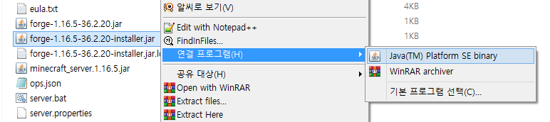(설치 후에도 되지 않는다면, installer.jar에 우클릭을 한 후 연결프로그램 탭을 열어주세요. 그 후 Java(TM) Platform SE binary를 선택해주시면 됩니다.)
