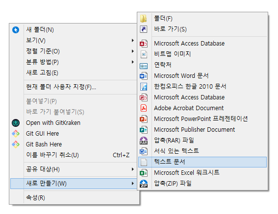 이제 실행파일을 만들어봅시다. 우클릭을 해 새로 만들기를 해주신 다음 택스트 문서를 선택해 주세요.