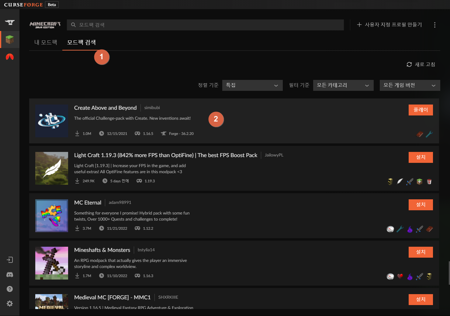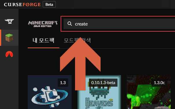 우선 원하는 모드팩을 CurseForge에서 찾아줍시다. 위의 모드팩 검색 탭을 누르신 다음, 아래에서 제목을 클릭해 들어가 주시면 됩니다.