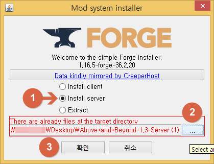 정상적으로 설치가 실행되신다면, Install server를 선택 후 경로를 압축을 푼 현재 폴더로 설정해 줍시다. 그 후 확인버튼을 눌러주세요. 꼭 2번의 경로설정을 해주셔야 합니다!